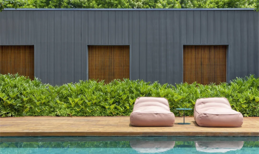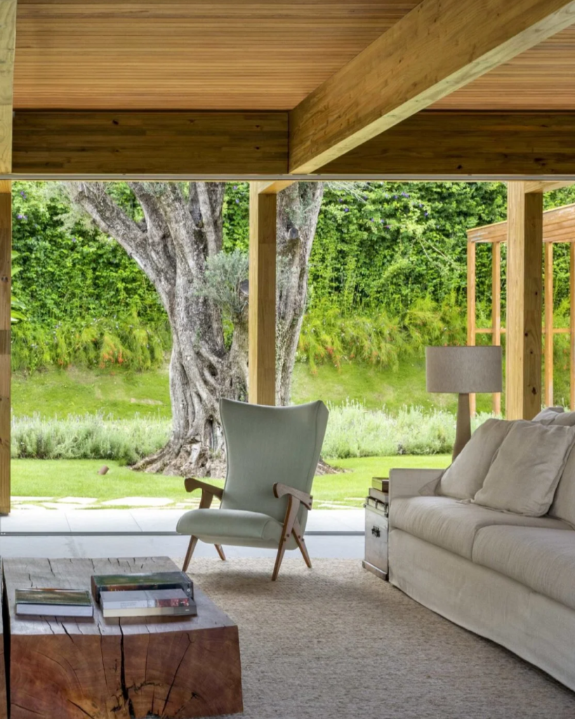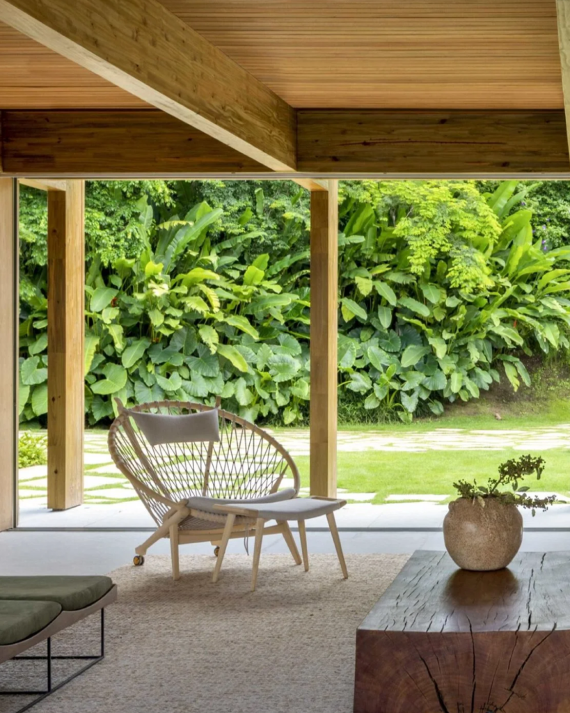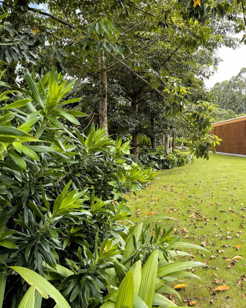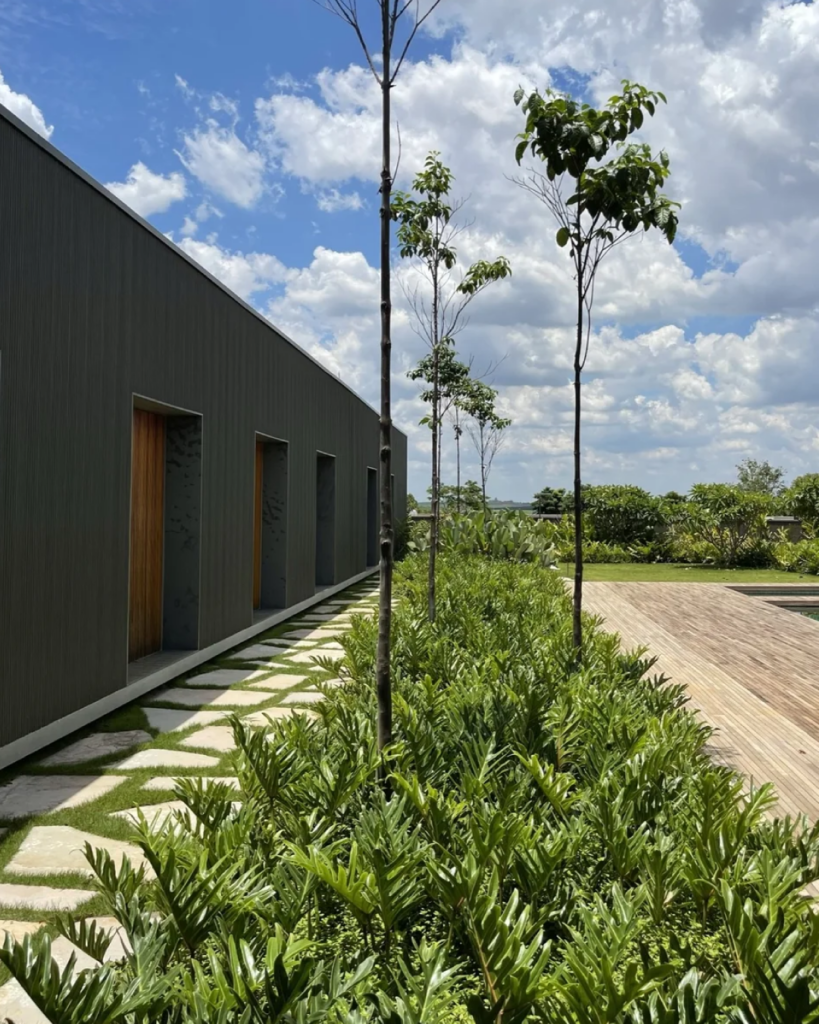 Na Residência DRM, o paisagismo se revela como um convite à contemplação. Planos de gramado, palmeiras e espécies tropicais se integram à arquitetura com suavidade, criando transições delicadas entre o interior e o exterior. Cada elemento foi pensado para reforçar o diálogo entre a casa e o ambiente natural da Fazenda Boa Vista, em Porto Feliz (SP).