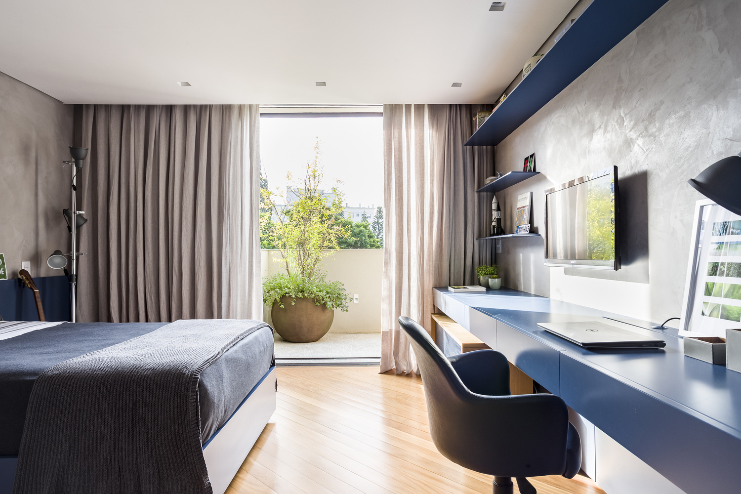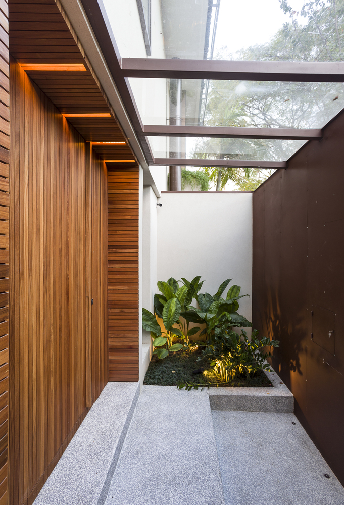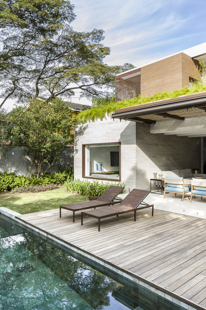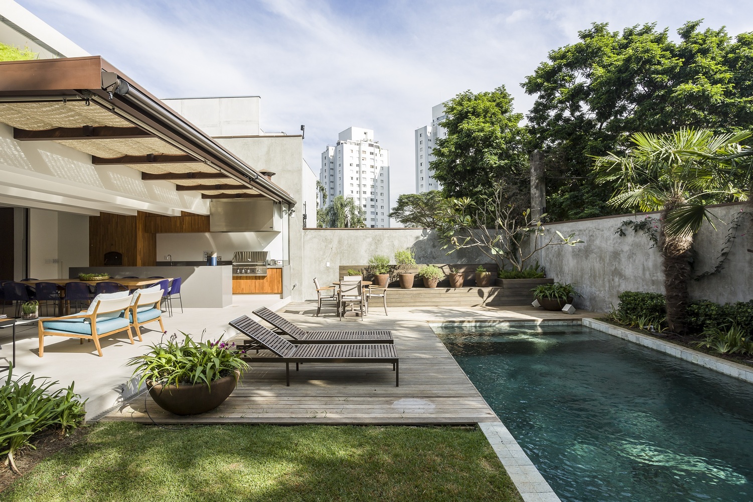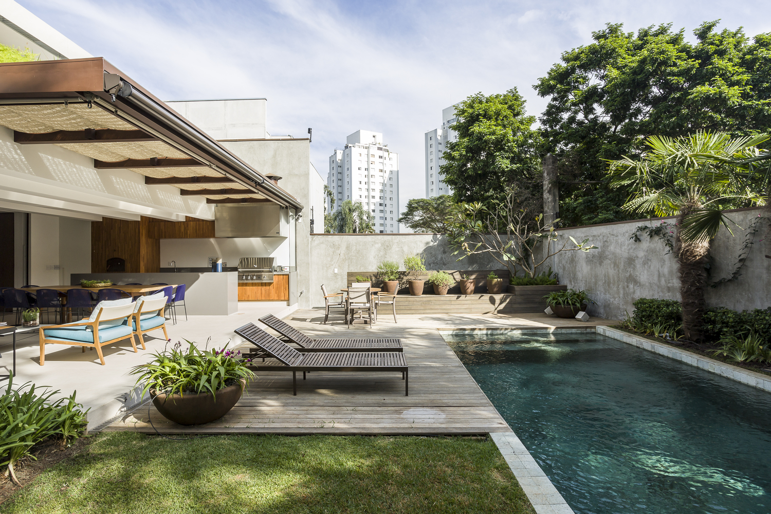 Como não poderia deixar de ser em um projeto que valoriza a vida ao ar livre, o verde desempenha um papel fundamental. O projeto de paisagismo, assinado por Marcelo Bellotto, invade a casa através de grandes panos de vidro, transformando o jardim em uma obra de arte viva que acompanha a convivência da família. A escolha da vegetação conversa diretamente com a arquitetura contemporânea, trazendo aquele respiro tão necessário em meio à agitação urbana de São Paulo.