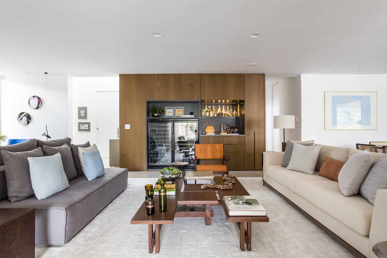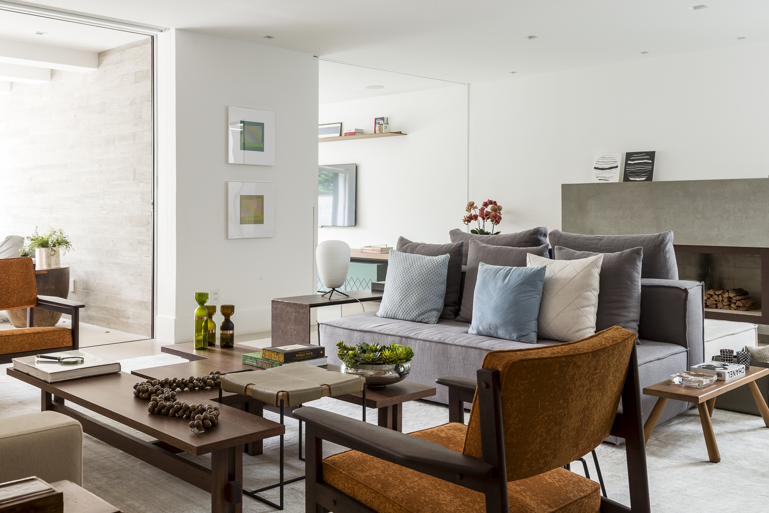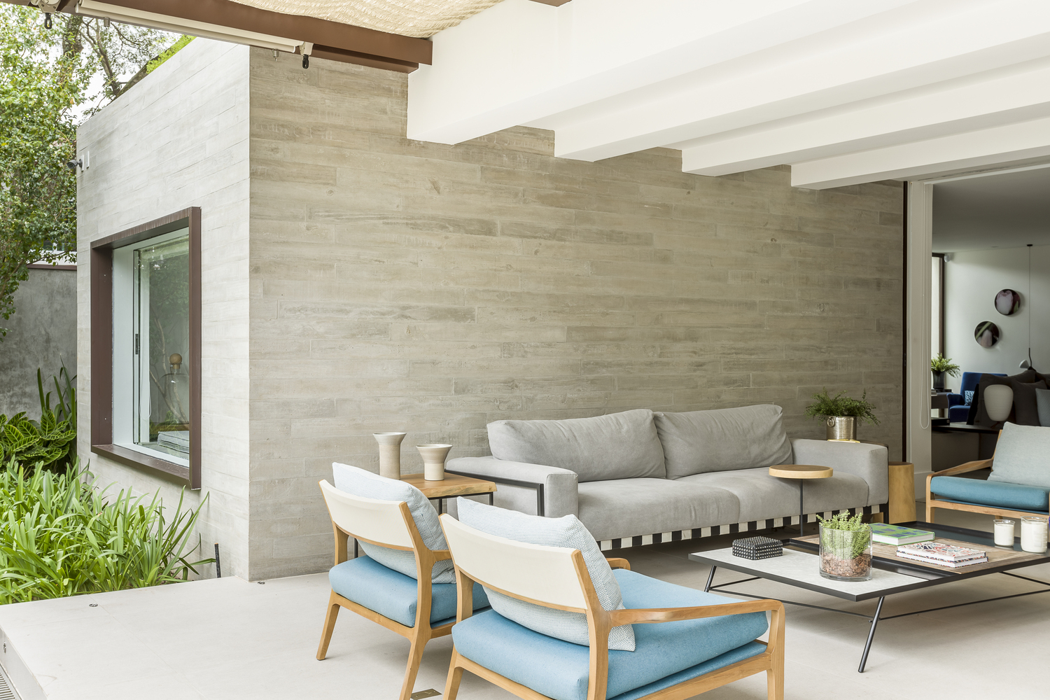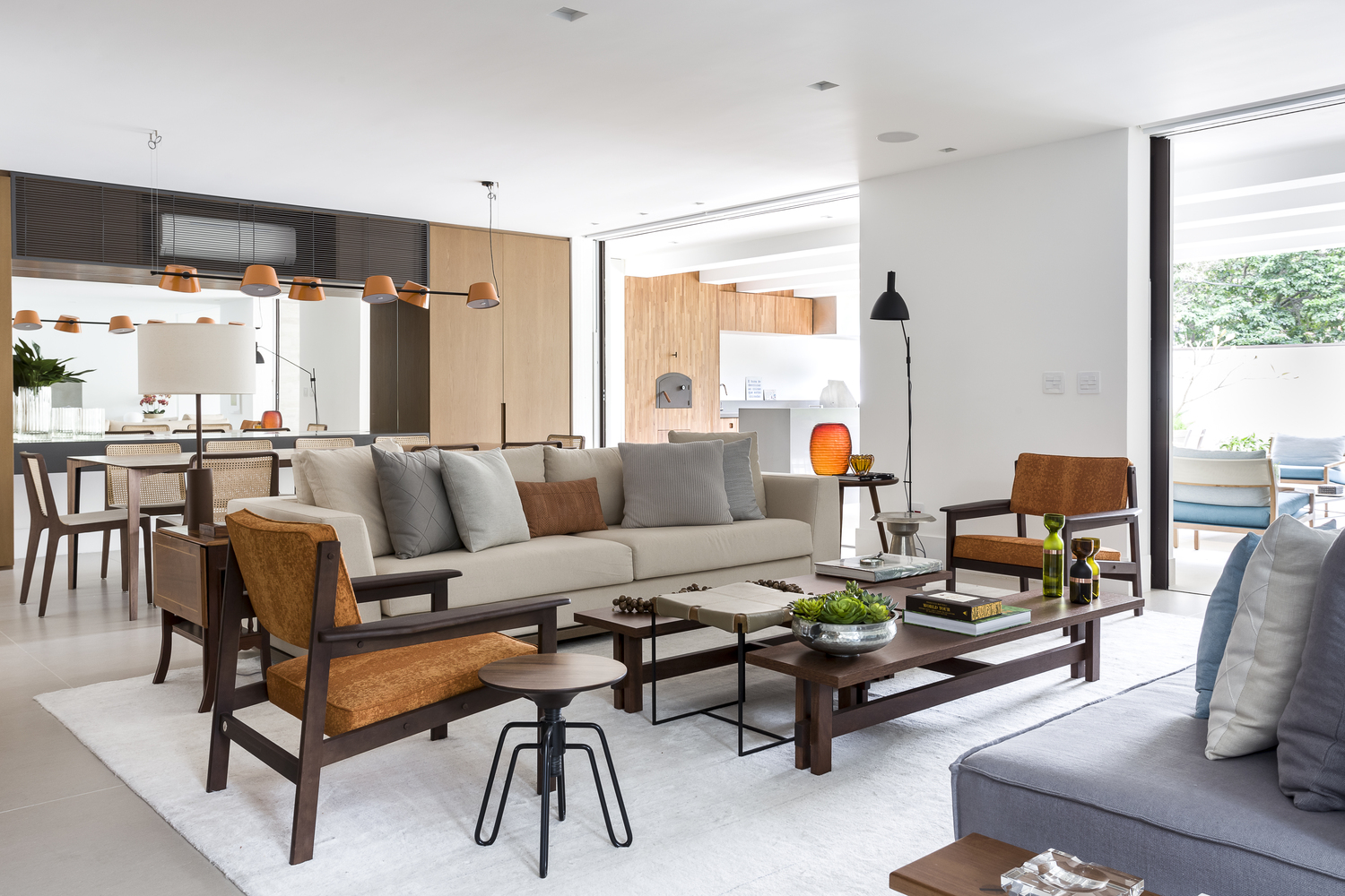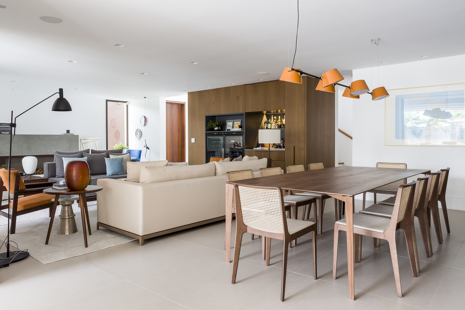 Nos interiores, a paleta de tons neutros impera, servindo de pano de fundo para a mistura de texturas e materiais ricos, como a madeira e o concreto. O mobiliário foi pensado para priorizar peças atemporais do design brasileiro, mescladas com itens mais despojados. Isso garante que a casa seja não apenas sofisticada, mas também funcional, prática e extremamente acolhedora para o uso diário da família.