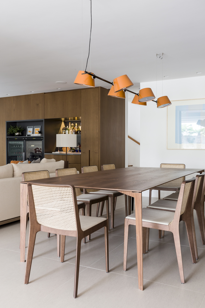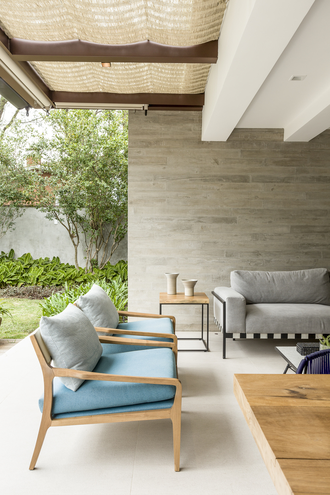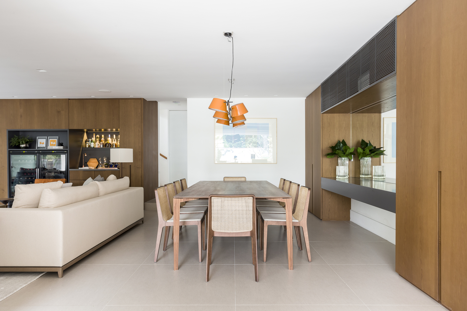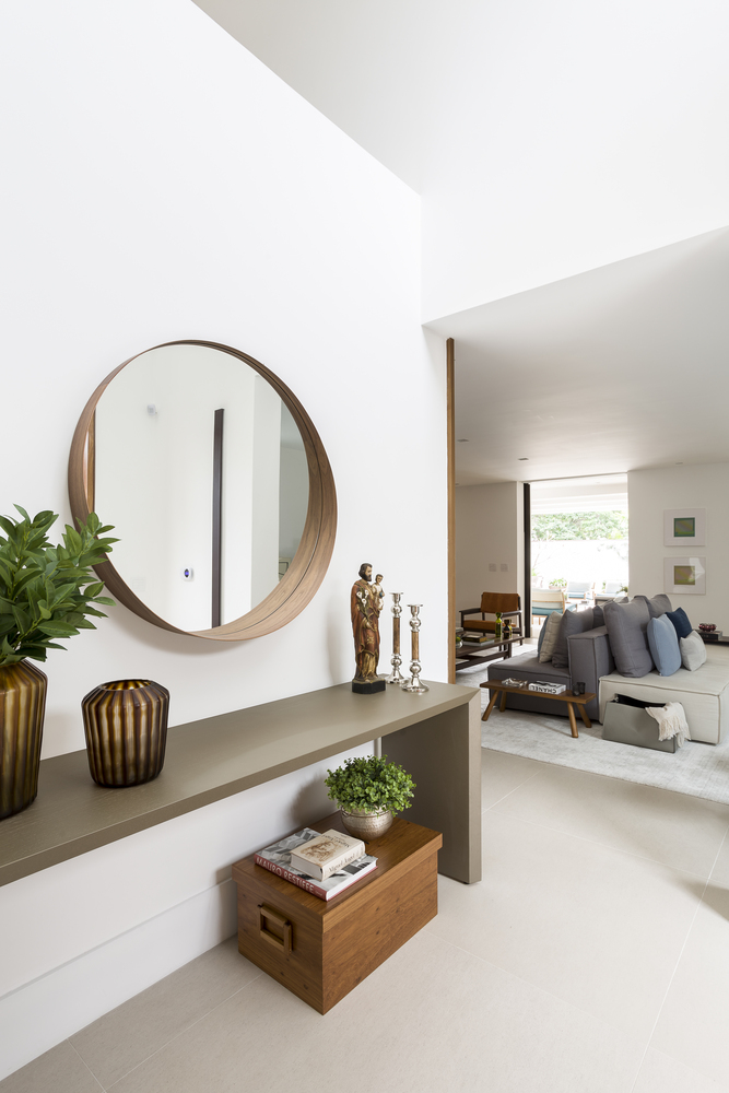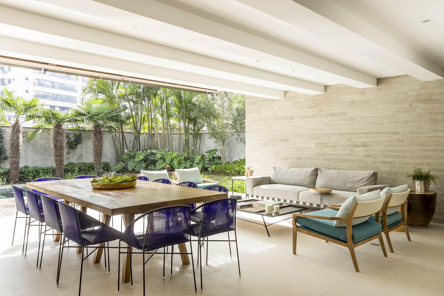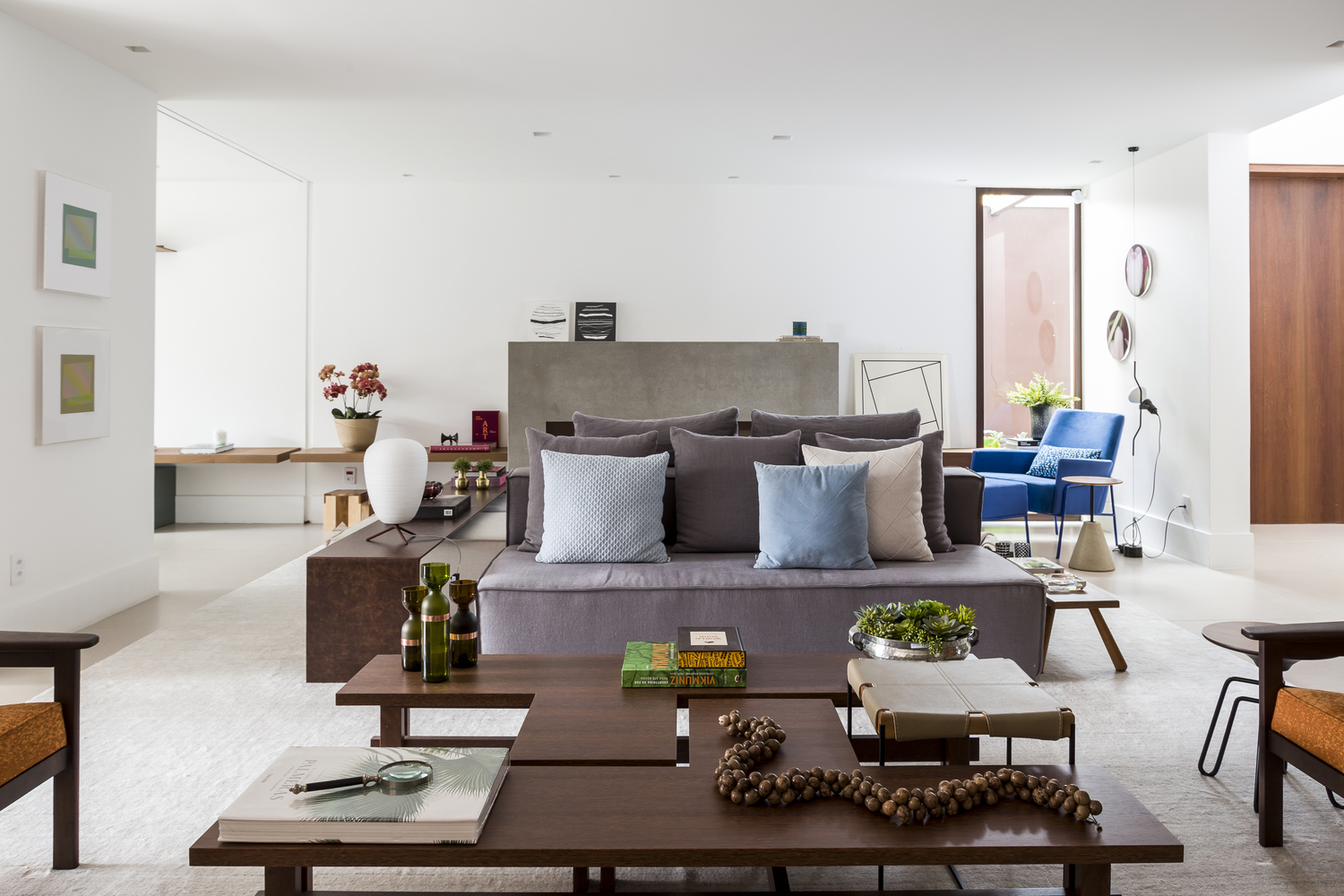 Nos interiores, a paleta de tons neutros impera, servindo de pano de fundo para a mistura de texturas e materiais ricos, como a madeira e o concreto. O mobiliário foi pensado para priorizar peças atemporais do design brasileiro, mescladas com itens mais despojados. Isso garante que a casa seja não apenas sofisticada, mas também funcional, prática e extremamente acolhedora para o uso diário da família.