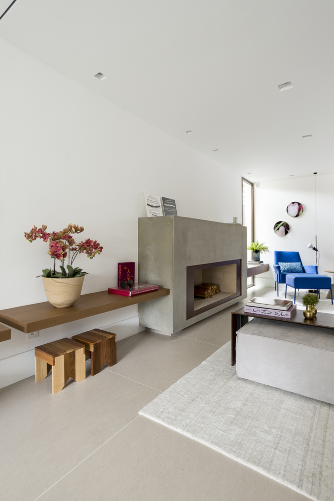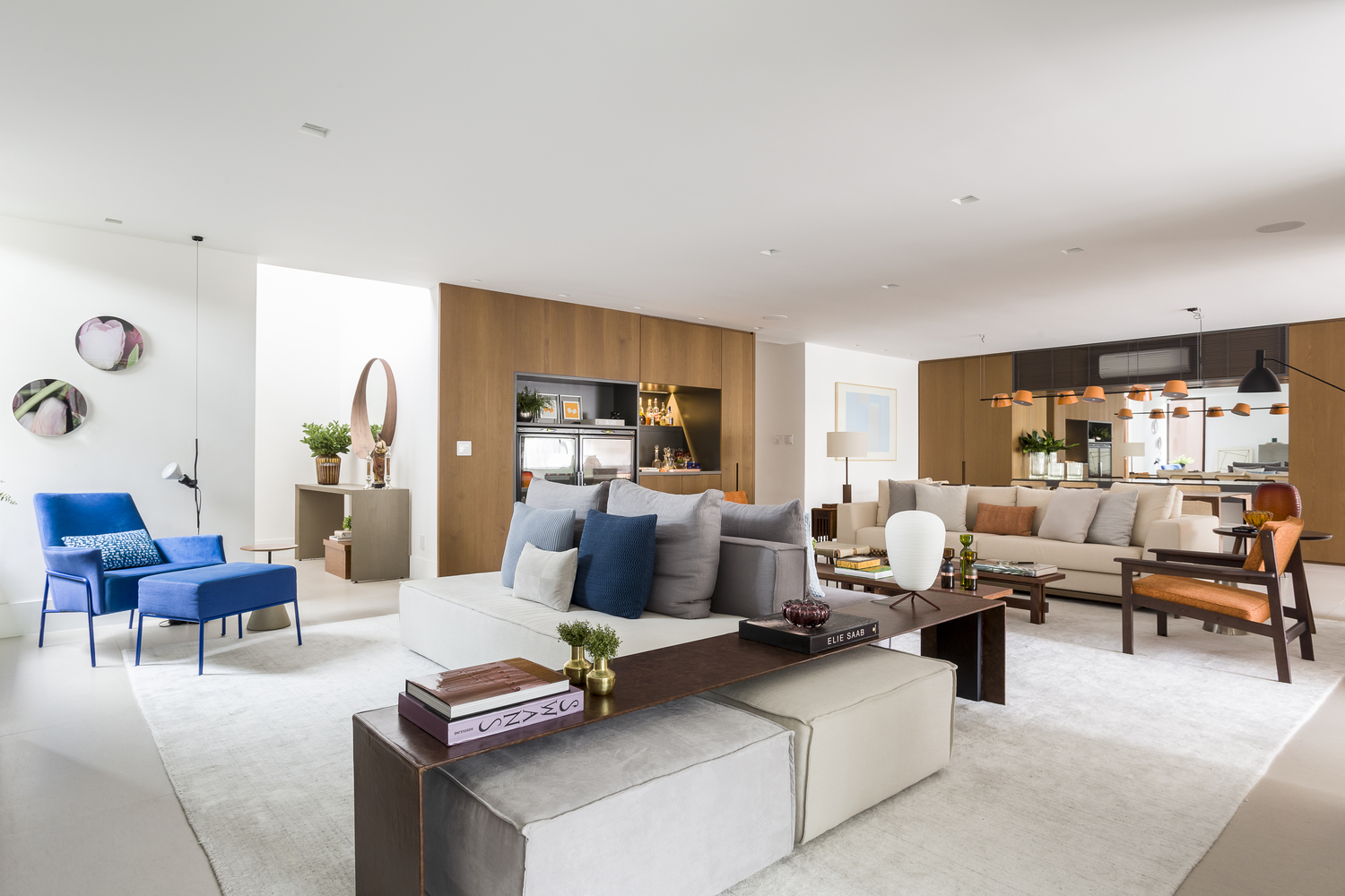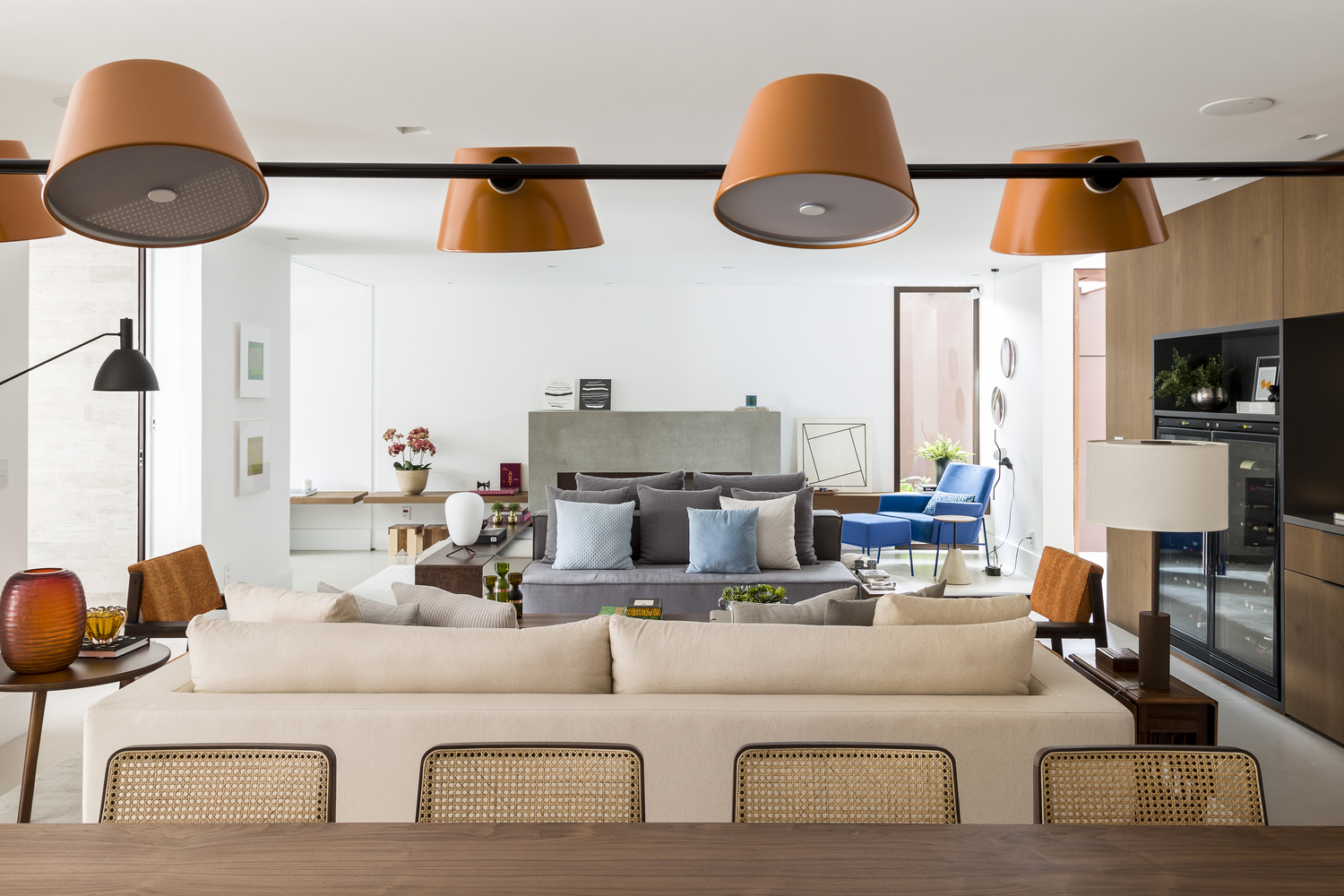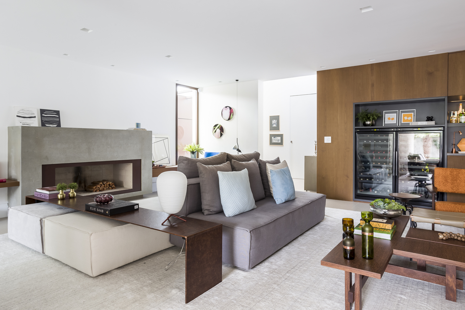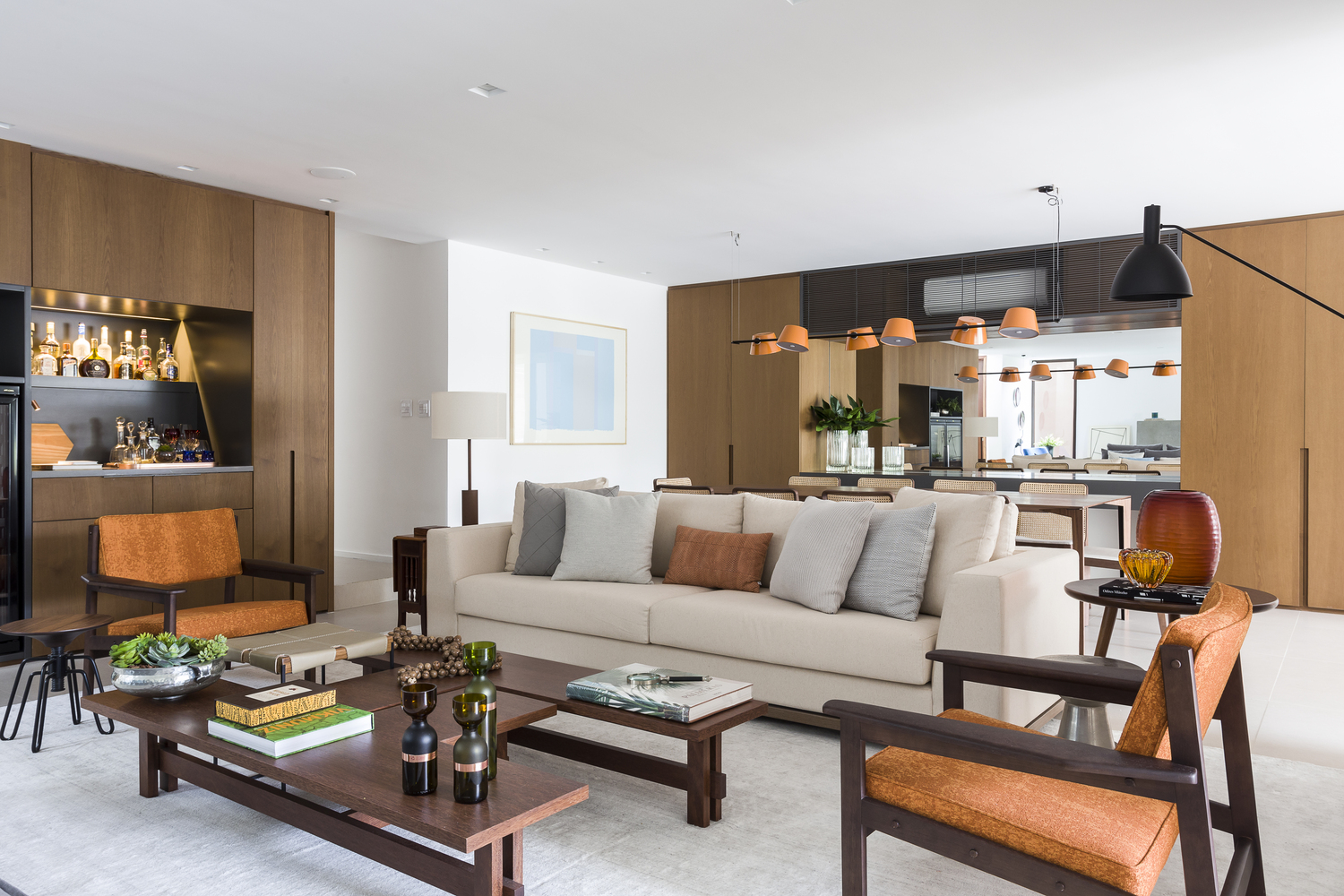 Nos interiores, a paleta de tons neutros impera, servindo de pano de fundo para a mistura de texturas e materiais ricos, como a madeira e o concreto. O mobiliário foi pensado para priorizar peças atemporais do design brasileiro, mescladas com itens mais despojados. Isso garante que a casa seja não apenas sofisticada, mas também funcional, prática e extremamente acolhedora para o uso diário da família.