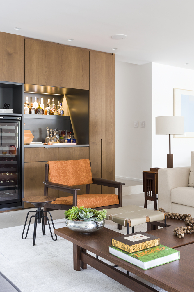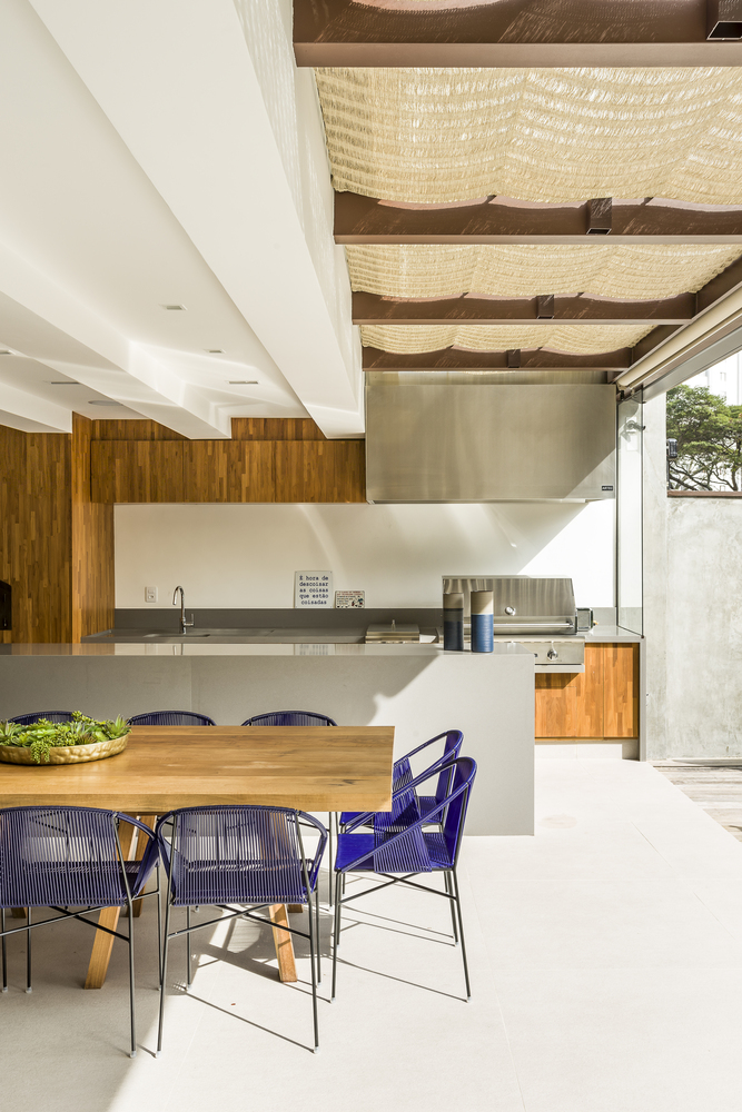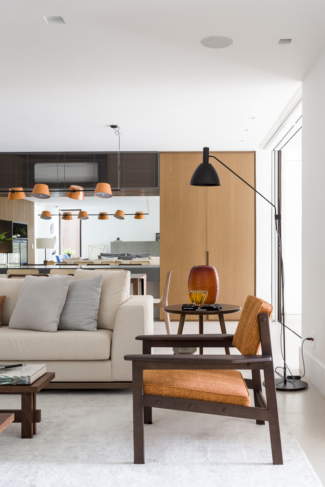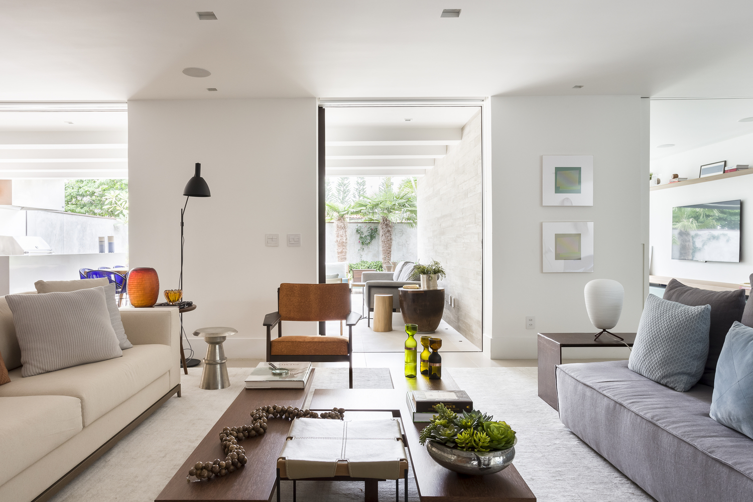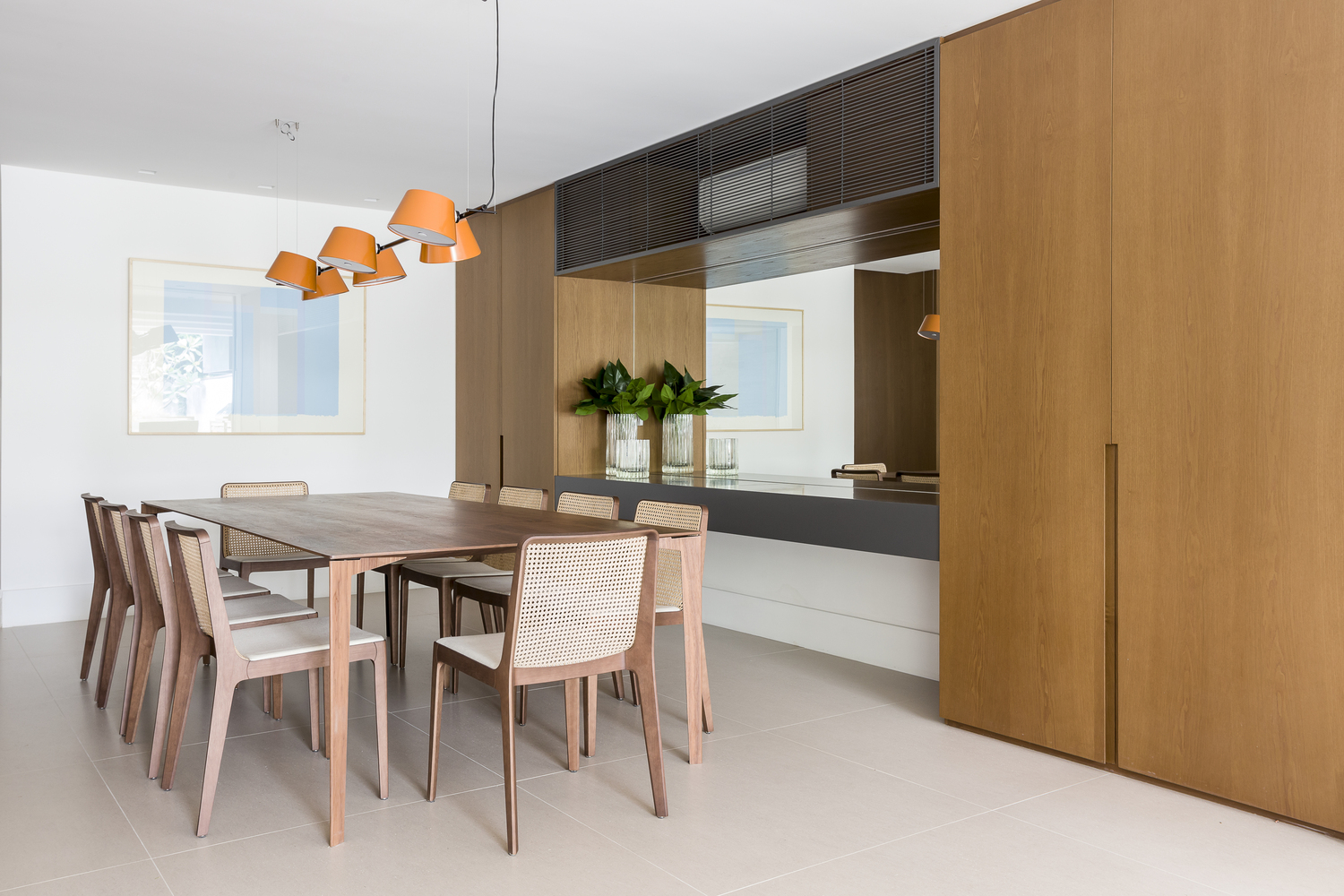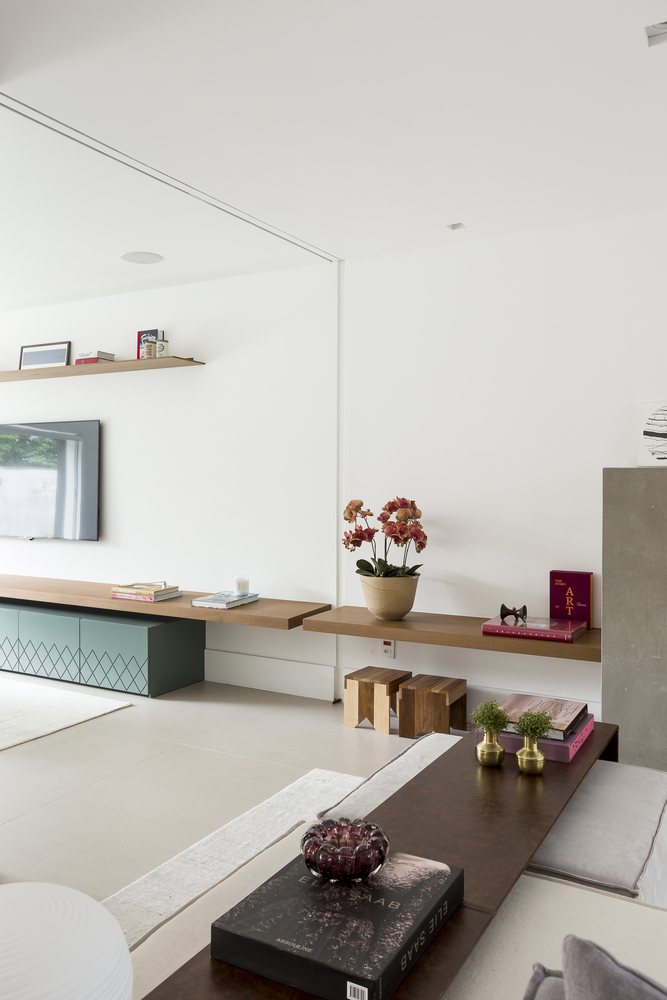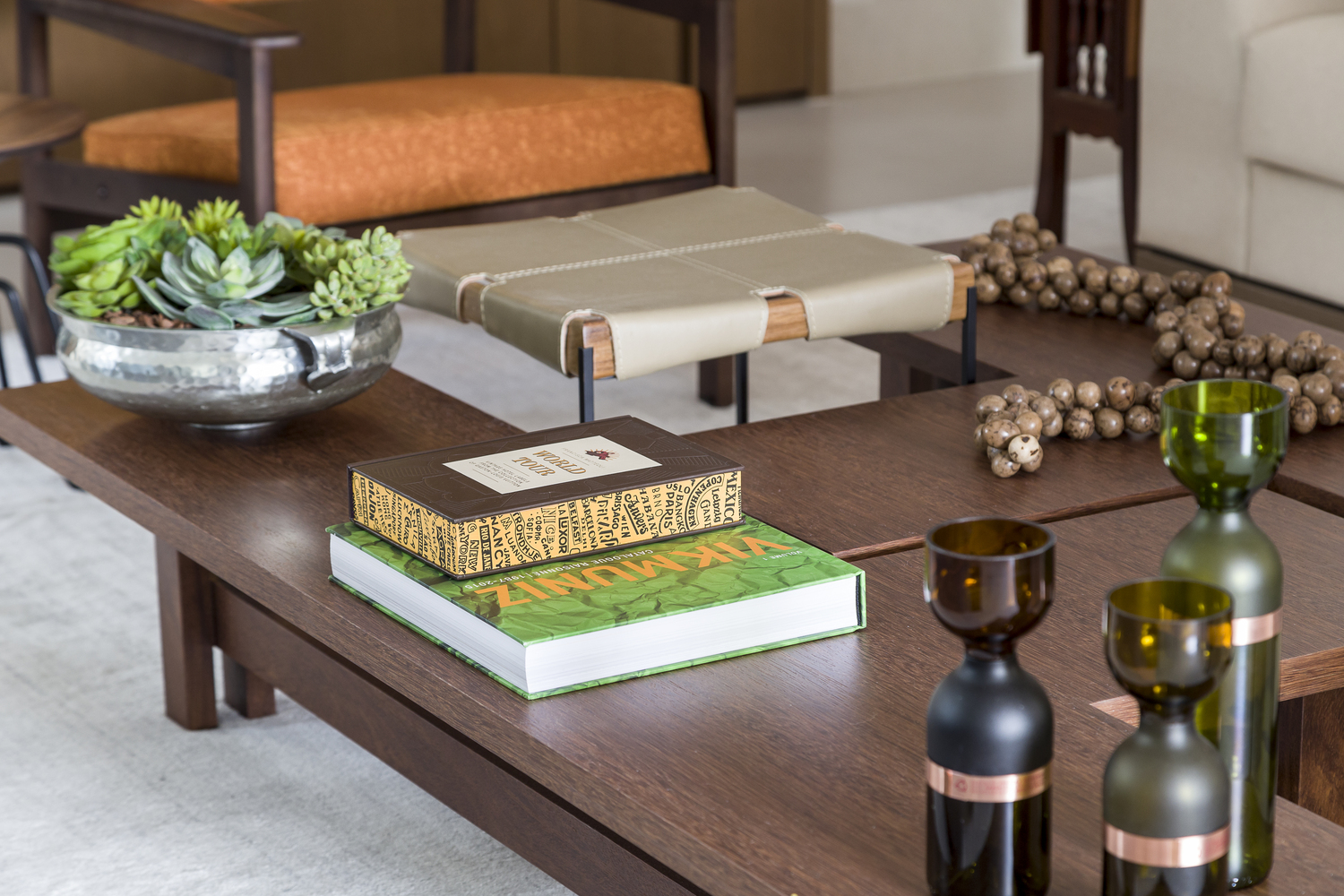 Nos interiores, a paleta de tons neutros impera, servindo de pano de fundo para a mistura de texturas e materiais ricos, como a madeira e o concreto. O mobiliário foi pensado para priorizar peças atemporais do design brasileiro, mescladas com itens mais despojados. Isso garante que a casa seja não apenas sofisticada, mas também funcional, prática e extremamente acolhedora para o uso diário da família.