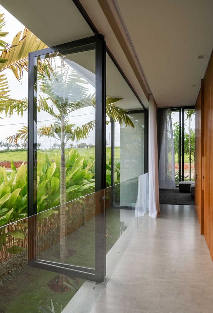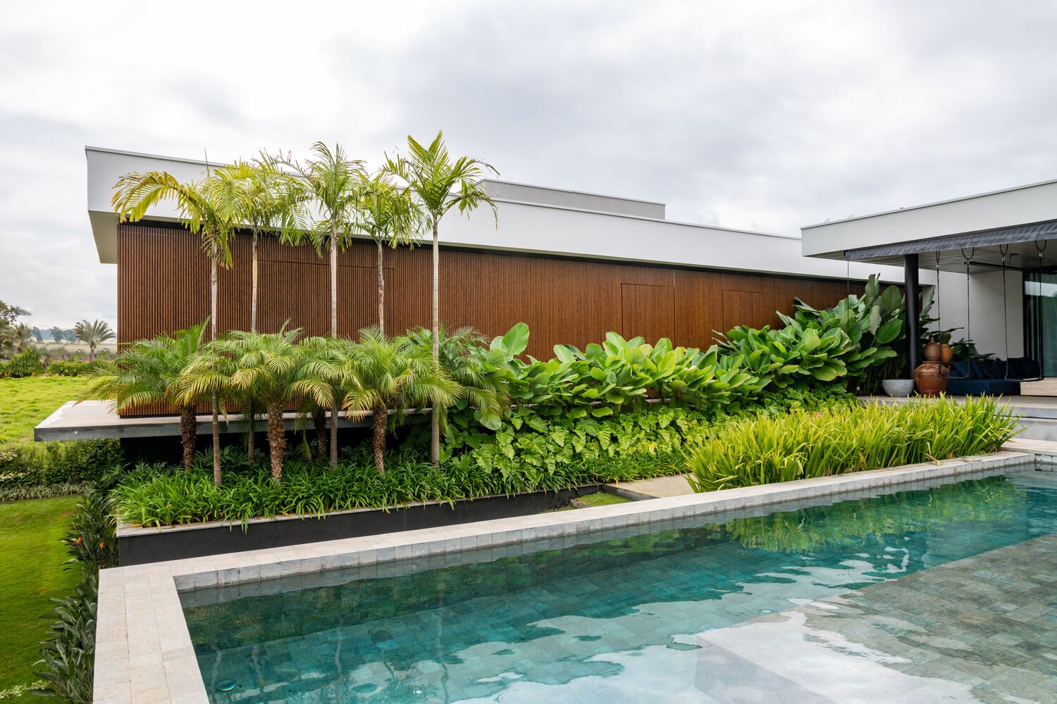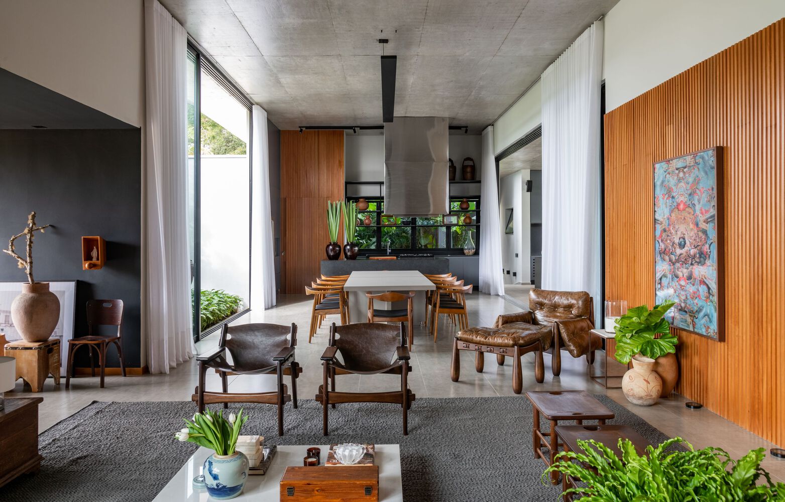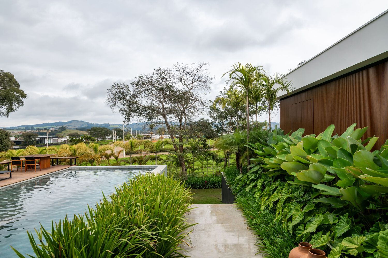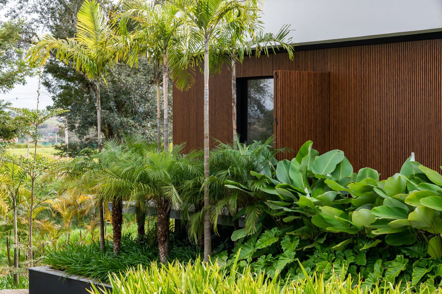 A conexão com a natureza foi um pedido central dos moradores, e o paisagismo, assinado por Flávia D´Urso, atua como elemento unificador do projeto. A casa foi projetada para que todos os ambientes trouxessem a contemplação do jardim.