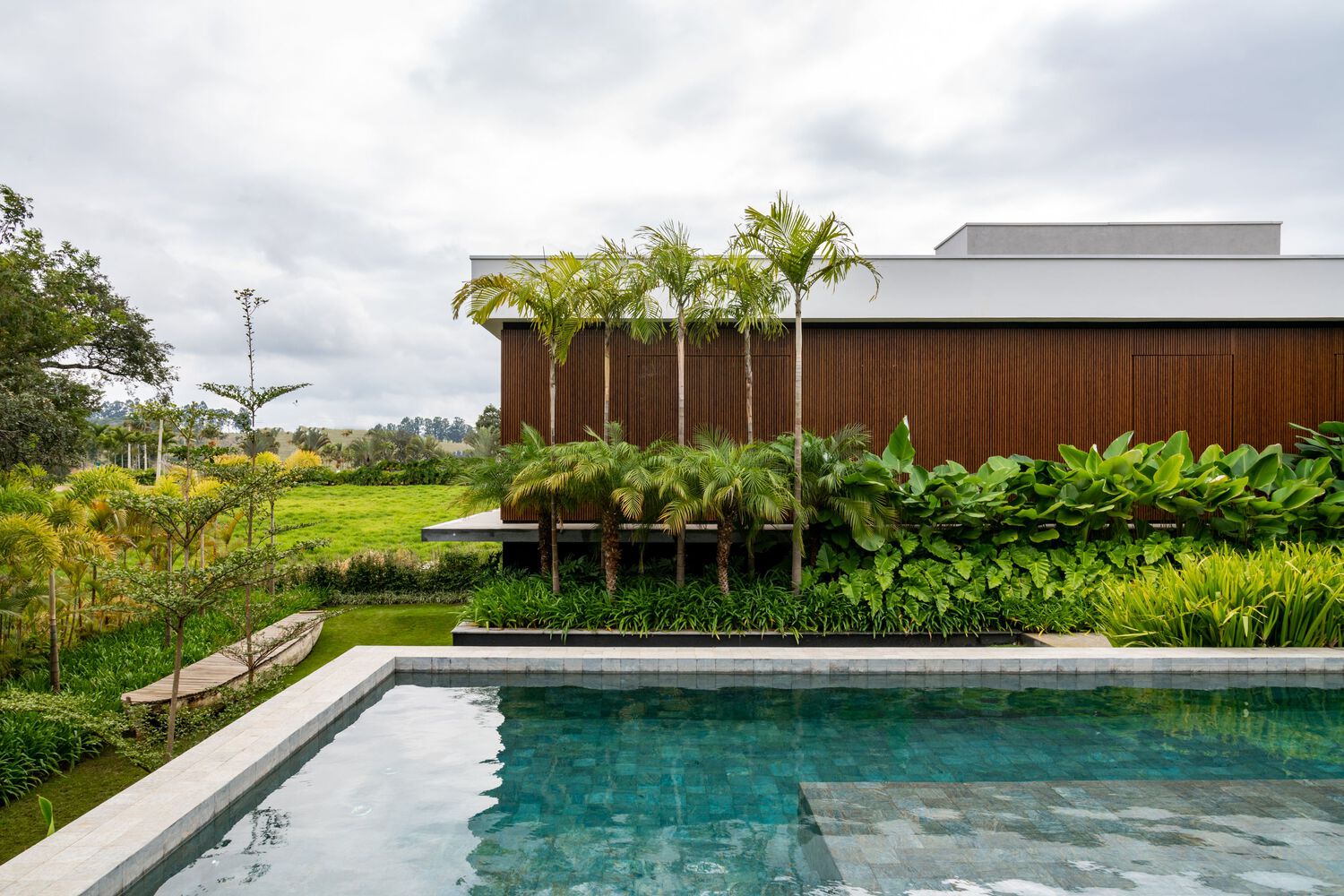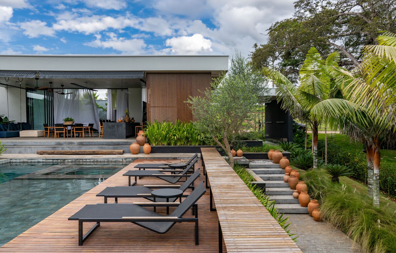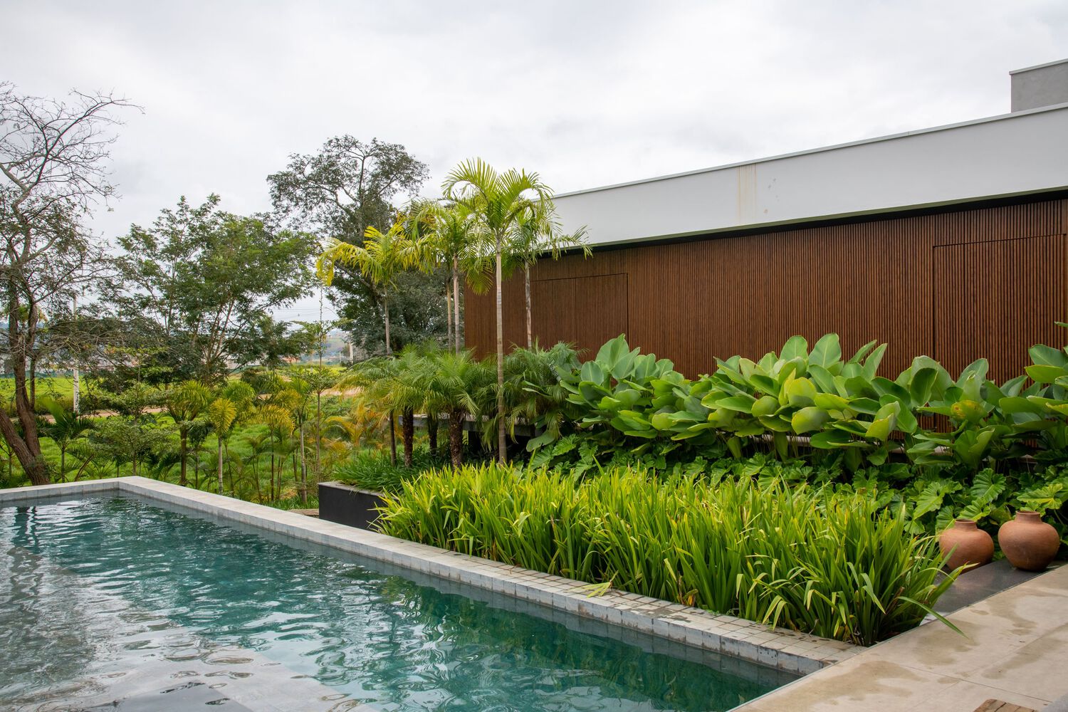 • Piscina e Braseiro: A piscina, inteiramente revestida em pedra sabão, é cercada pelo paisagismo exuberante. Uma escada repleta de vasos de cerâmica conduz ao nível abaixo, onde uma lareira embutida cria um ambiente de braseiro, perfeito para noites de convívio.