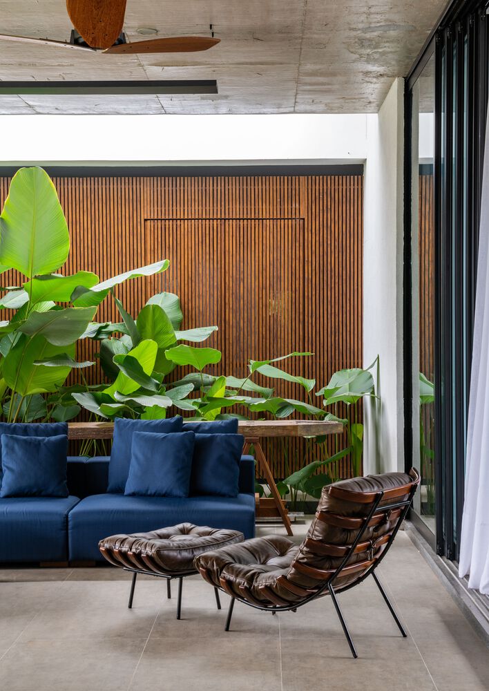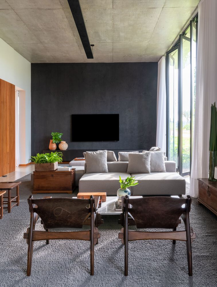 • Living: O Living traz o concreto no piso e no teto, mas essa frieza é equilibrada por painéis ripados de madeira, que injetam calor e promovem a sensação de conforto.