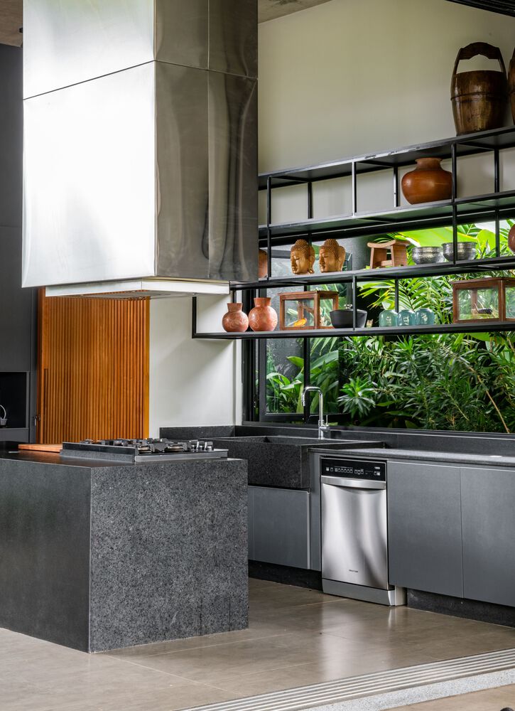 • Cozinha: A cozinha atende ao pedido do morador sendo totalmente cercada de plantas, criando uma atmosfera fresca e acolhedora.