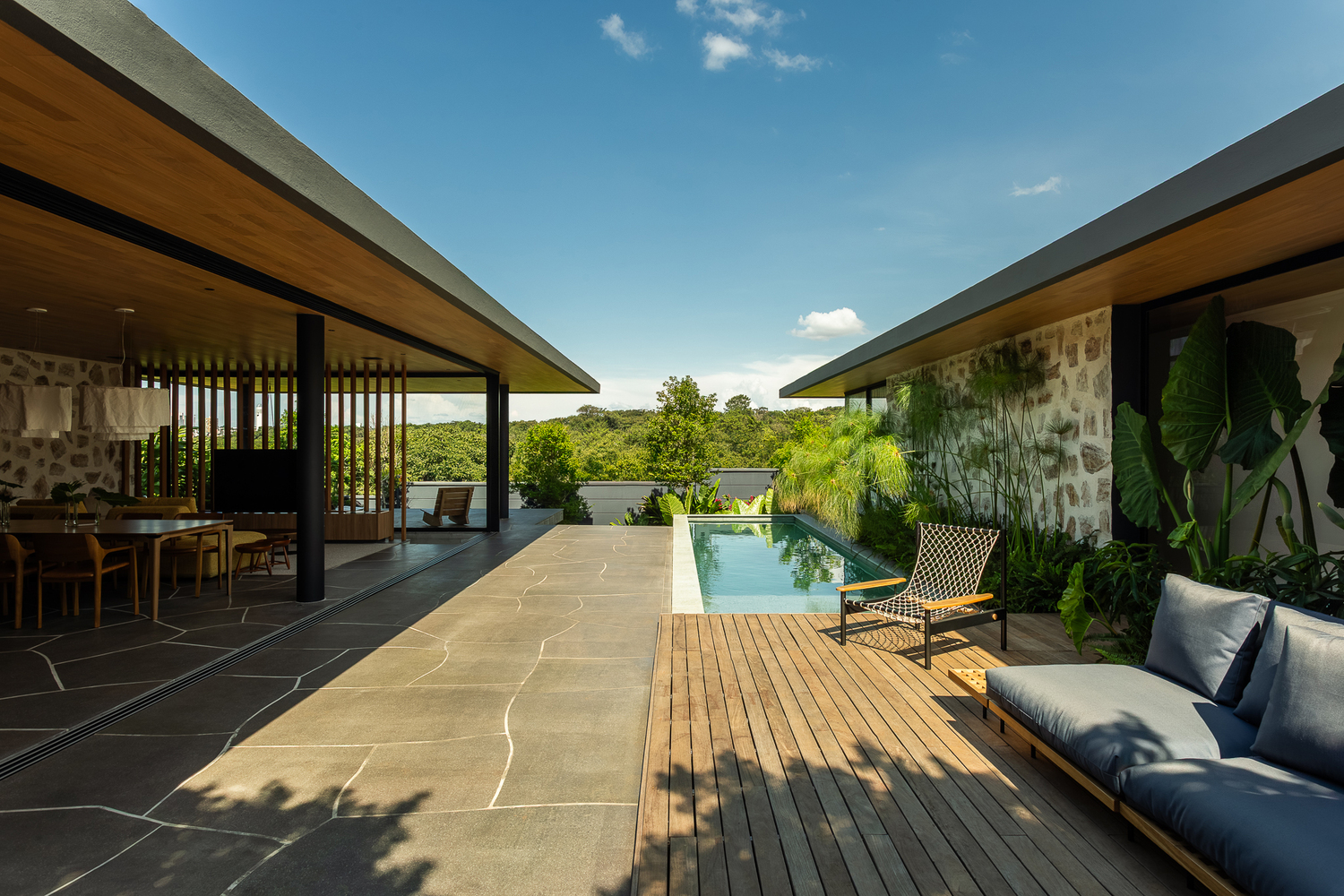 A leveza visual da residência é reforçada pela cobertura, que, protegida pela estrutura, é emoldurada por um forro de madeira que emoldura a reserva verde presente ao fundo do lote.