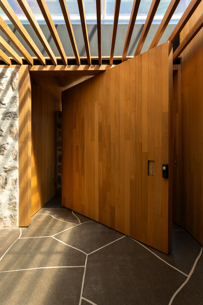 A materialidade escolhida busca um diálogo entre o rústico e o contemporâneo: as paredes em pedra, com acabamento em emassadas, trazem uma leve rusticidade, harmonizando-se perfeitamente com o piso de basalto de formato orgânico, reforçando a conexão com o entorno natural.