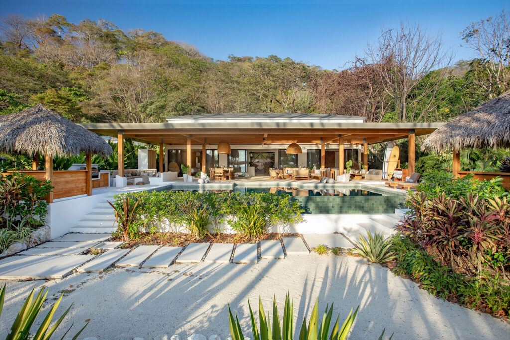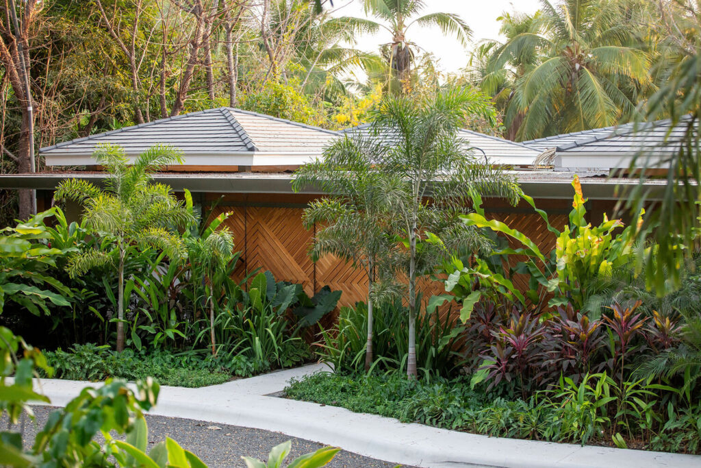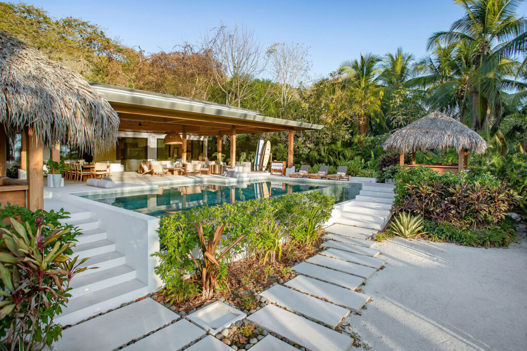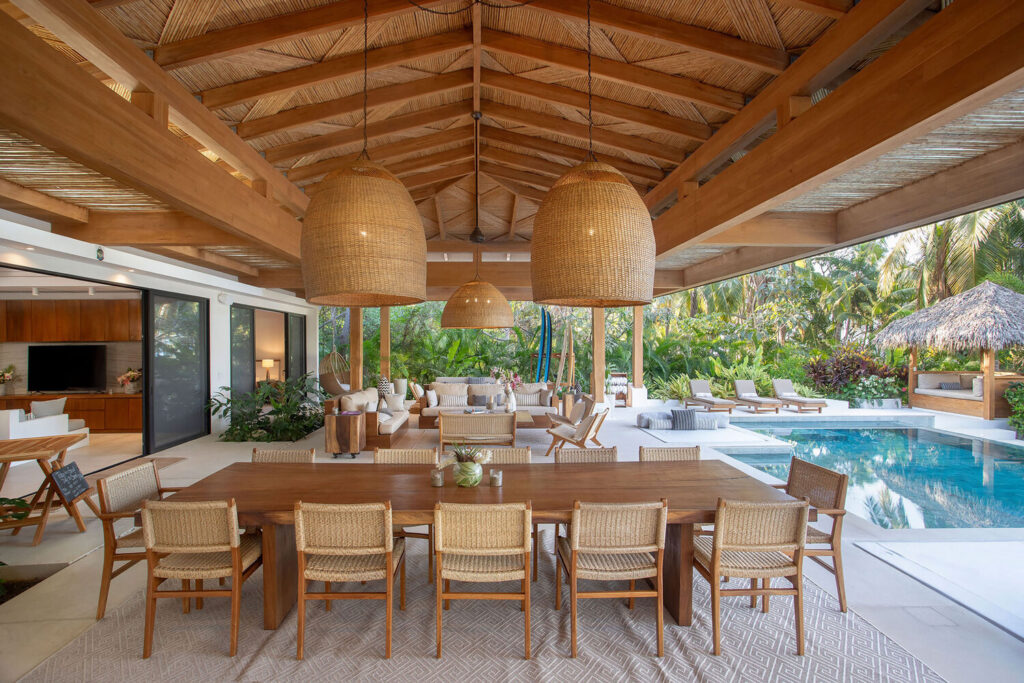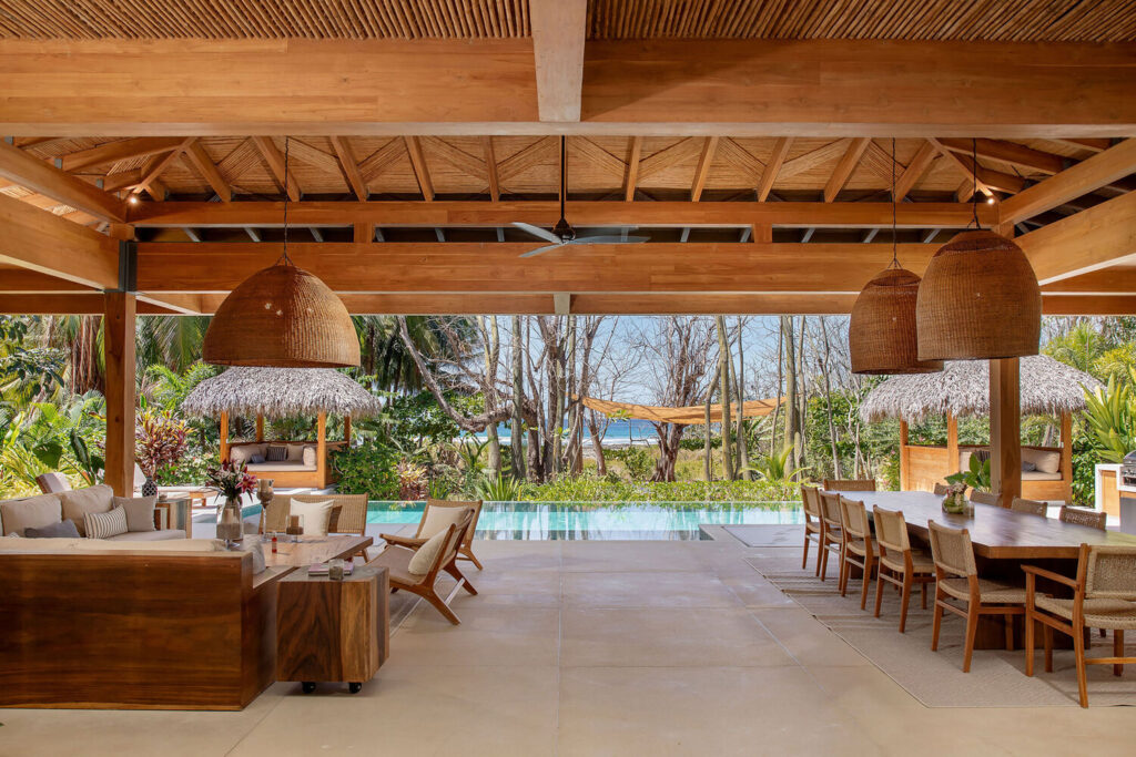Os terraços amplos, os tetos de cana e o paisagismo exuberante, composto por palmeiras e espécies tropicais, reforçam a atmosfera leve e natural.