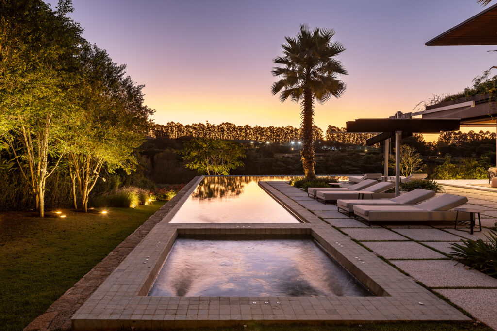 O espaço social integra o gourmet e se estende para um estar externo mais íntimo, com um pé direito rebaixado que convida ao relaxamento. A transição entre o que é interno e o que é externo é suavizada por grandes aberturas envidraçadas, que não só amplificam a sensação espacial, mas também emolduram a vista panorâmica do lago ao fundo do terreno.